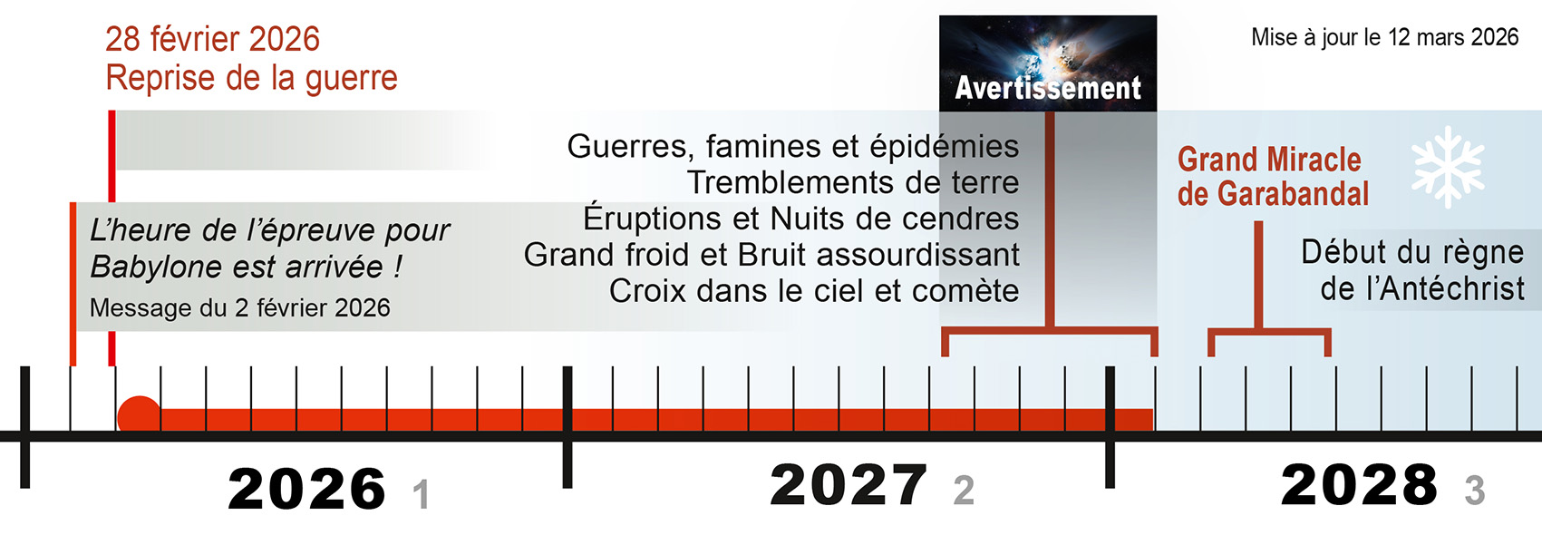 L’Épiphanie, « manifestation » en grec, commémore la manifestation de Dieu au monde, ce qui rappelle l’Avertissement. En janvier 2028, l’Épiphanie sera fêtée le dimanche 2 janvier. Donc l’Avertissement pourrait survenir le samedi 1er janvier 2028, jour de repos quasi universel.