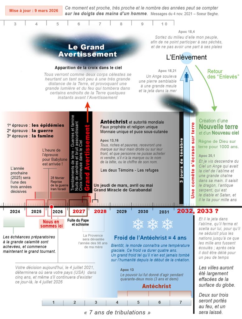 En cherchant dans les messages du site de Sœur Beghe, je tombe sur ce texte qui apporte enfin une clarification de la chronologie pour la fin des temps. J’ai rajouté les sous-titres.