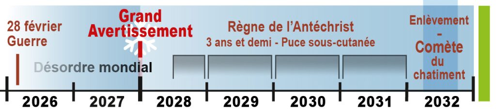 L’Avertissement est donc prévu pour fin 2027 (ou janvier 2028), ce qui mettra fin aux guerres, mais une dictature onusienne émergera, avec à sa tête l’Antéchrist.