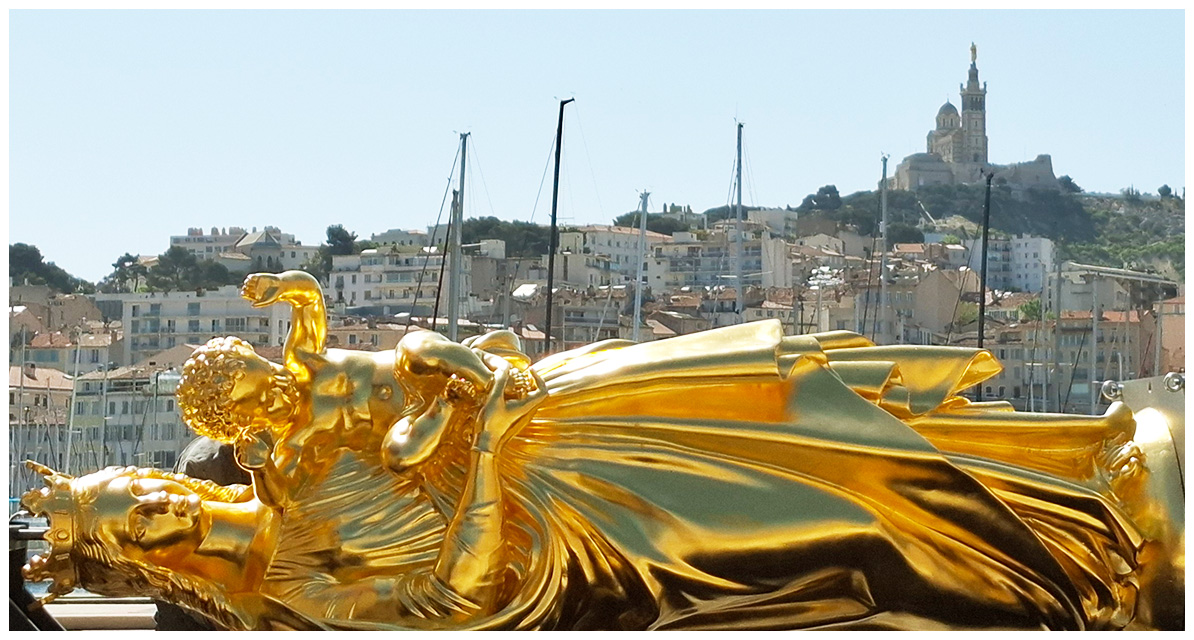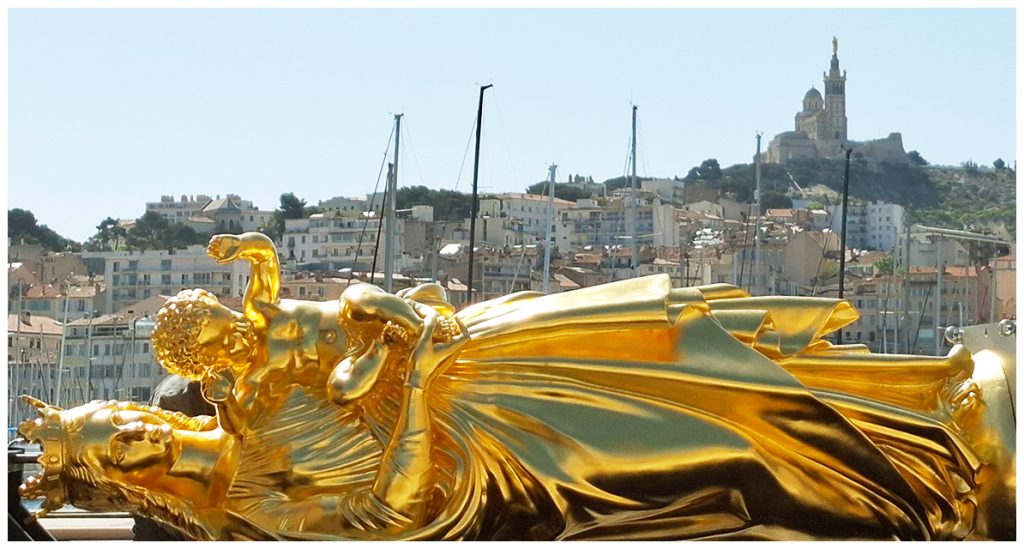 Vincent, le 28 avril 2026 : Je reviens d’une semaine en Provence. Lors d’une journée passée à Marseille, on a assisté à une scène insolite. Une réplique de la statue de la Basilique Notre-Dame de la Garde (la grande église au fond à droite de la photo) qui s’apprêtait à être mise en fonction, mais qui, en attendant, se trouvait couchée sous nos yeux.